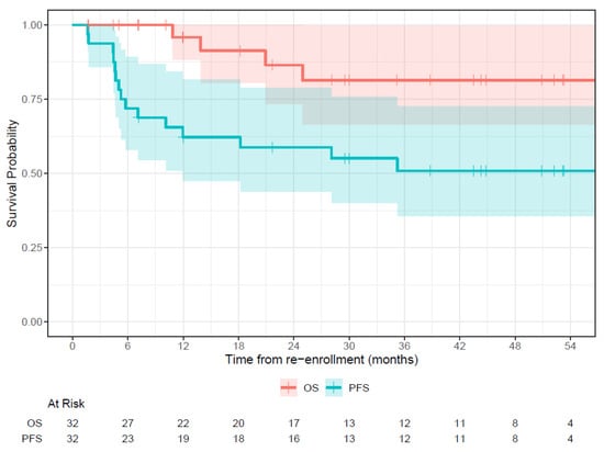 Survival outcome after second vaccine therapy among 32 relapsed vaccine patients; progression-free survival (PFS) and overall survival (OS).