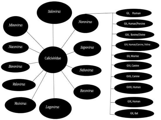 Norovirus genera within the Caliciviridae family. The established genogroups are designated GI–GX beside their corresponding host species of origin.