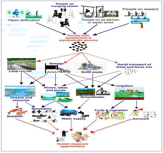 The large number of noroviruses excreted in faeces suggests that virus titres in wastewaters receiving such faecal matter are high [6]. In developing countries with poor socioeconomic conditions, not more than 28% of the wastewater is normally treated prior to the release into surface waters, a practice known to promote the environmental ubiquity of enteric viruses and transmission via aquatic pathways [70]. Even after sewage treatment, norovirus contamination of water with effluent discharges has been reported [71]. The contamination of water through malfunctioning sewage systems, sewage overflows, and runoff from polluted stormwater increases the chances of norovirus transmission [72]. Based on waterborne transmission, four major hydrological emission pathways have been conceptualised from reference [70] (Figure 2), namely the connected emissions from sewerage systems in the population accessing surface water directly or following treatment, direct emissions emanating from urban and rural population settings using hanging toilets, diffuse emissions arising from the urban and rural populations practicing open defecation, and onsite emissions from large population settings using pit latrines or septic tanks. Opportunities for human exposure to noroviruses can occur when food crops and green vegetables irrigated with wastewater and filter feeders that have concentrated norovirus in their edible tissues, are consumed raw or without proper cooking. In addition, drinking of sewage-contaminated water and recreational water exposure increases the risk of waterborne transmission of the virus [72]. Outbreaks of norovirus infection have been linked to ice cubes and a leaking air ventilation valve [73], potable water sources at camps [74], municipal water systems [75], and recreational water exposure [76].