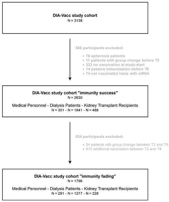 The non-interventional, investigator-driven, multicenter, prospective Dia-Vacc study (NCT number: 04799808) started with SARS-CoV-2 vaccination using either 2x BNT162b2mRNA or 2x 1273-mRNA in 26 nephrology centers from 15 January to 24 February 2021 and investigated the time course of a specific cellular and/or humoral immune response to disease and/or SARS-CoV-2 vaccination in MP, DP, and KTR [1]. From the complete Dia-Vacc study cohort, all participants exposed to two mRNA vaccinations (either 2x BNT162b2-mRNA or 2x mRNA-1273) between T0 and T2 (two months) were investigated and separated into a COVID group with COVID-19 pre-exposure, as found by positive PCR due to disease symptoms (symptomatic disease) or by anti-Spike or nucleocapsid antibodies before vaccination (asymptomatic disease). The non-COVID group without COVID-19 pre-exposure did not meet any of the criteria defined above. Immunity success rates after vaccination and dependent on COVID-19 pre-exposure were investigated in a Dia-Vacc cohort where de novo symptomatic or asymptomatic COVID-19 participants between T0 and T2 were excluded. For all immunity fading evaluations between T2 and T9 (nine months), de novo symptomatic or asymptomatic COVID-19 participants between T0 and T9, as well as participants with additional vaccinations between T2 and T9, were excluded.