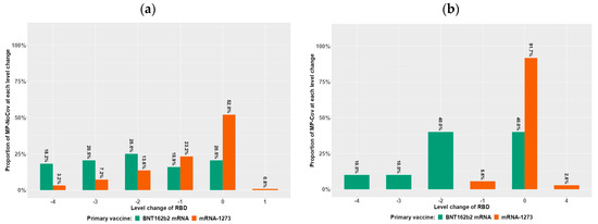 In contrast, using an RBD level categorization change of at least three levels between T2 and T9 as a measure for “strong RBD antibody decline”, separated by COVID-19 pre-exposure type, multivariable analysis indicated symptomatic disease as an independent factor, being eight times more inhibitory of a strong RBD-Ab decline compared to asymptomatic disease (Table 8). These results can also be appreciated visually, where RBD level categorization changes are shown in a clinical subtype- (Figure 3) and mRNA vaccine type (BNT162b2-mRNA in green and mRNA-1273 in brown)-dependent manner. Supporting RBD level categorization change data, humoral immunity fading, as indicated by a 50% titer decrease within the time period, occurred in reduced rates in symptomatically versus asymptomatically pre-exposed DP, representing 16% versus 34% (p = 0.012) for IgA-Ab, 1% versus 15% for IgG-Ab (p = 0.003), and 1% versus 13% for RBD-Ab (p = 0.007) (data not in tables).