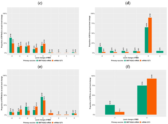 Using RBD level categorization changes between T2 and T9 as a measure for RBD antibody fading/decline separated by COVID-19 pre-exposure/hybrid immunity (Figure 2b,d,f and Figure 2a,c,e) and mRNA vaccine type (BNT162b2-mRNA in green and mRNA-1273 in brown), the above results from the multivariable analysis can be appreciated visually (Figure 2). Negative level changes from −1 to −4 levels expressing the degree of RBD antibody fading are frequent in all study subgroups without COVID-19 pre-exposure and less frequent in subgroups with hybrid immunity. Hereby, study participants who were pre-exposed to COVID-19 and vaccinated with mRNA-1273 demonstrated hardly any or only minor level changes between two and nine months (Figure 2b,d,f).