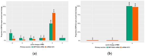 The change of RBD level categorization between T2 and T9 in dialysis patients (DP) dependent on the clinical type of hybrid immunity (asymptomatic versus symptomatic); (a) DP with asymptomatic hybrid immunity; (b) DP with symptomatic hybrid immunity.