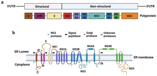 Flavivirus genome organization and polyprotein processing. (a) The flavivirus +ssRNA genome is flanked by 5′ and 3′UTRs and encodes for a single ORF that is translated into a single polyprotein in the ER. (b) Cleavage of the polyprotein by host and viral proteases generates 10 functional proteins: the 3 structural proteins (C, prM, and E) and 7 non-structural proteins (NS1–NS5). Arrows indicate proteolytic cleavage sites.