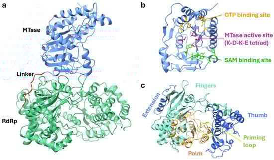 Structure of ZIKV NS5 (PDB, 5U0B). (a) Ribbon representation of the MTase and RdRp domains. (b) Key residues required for GTP- and SAM-binding and MTase activity. (c) The fingers, palm, and thumb subdomains of the RdRp domain; the extension that connects the MTase and RdRp domains through the linker (in red); and the conserved priming loop required for RNA polymerization. For detailed information on the ZIKV MTase and RdRp domains and key residues, refer to [96,97,99,101].