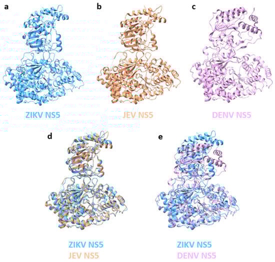 Comparison of ZIKV NS5 structure to JEV and DENV NS5. (a) ZIKV NS5 (PDB, 5U0B); (b) JEV NS5 (PDB, 4K6M); and (c) DENV NS5 (PDB, 4V0Q). (d) Superposition of ZIKV and JEV NS5, and (e) ZIKV and DENV NS5 structures was performed with ChimeraX (v1.7) software.