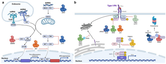 The diverse strategies of flaviviral NS5-mediated inhibition of the innate immune response. (a) Viral RNAs are recognized by host–pathogen recognition receptors, TLR3/7 and RIG-I/MDA5, leading to downstream activation of transcription factors NF-κB and IRF3/7. ZIKV NS5 inhibits IFN induction through interference in RIG-I, IKKε, TBK1, and IRF3 signalling. DENV NS5 inhibits the pro-inflammatory activity of NF-κB by inducing ERC1 degradation. JEV inhibits the nuclear translocation of NF-κB and IRF3/7. (b) ZIKV, WNV, and JEV NS5 inhibit STAT1 phosphorylation. ZIKV and DENV NS5 subvert host E3 ligases to induce STAT2 degradation. YFV NS5 interacts with STAT2 to inhibit ISGF3 engagement with ISREs. WNV, TBEV, and LGTV disrupt the maturation of IFNAR1 by binding to PEPD. TBEV and LGTV NS5 inhibit JAK-STAT signalling.