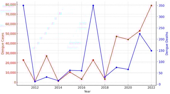 Asia bears 70% of the global dengue burden, with Pakistan, the world’s fifth largest population of 240 million, among the endemic countries experiencing seasonal surges in cases and the circulation of different dengue serotypes (DENV-1, DENV-2, DENV-3, DENV-4). In 2011, a devastating first large dengue outbreak of 22,938 cases was reported in Lahore, the capital city of the Punjab, in which at least 350 people died due to DHF and DSS []. Since 2011, Pakistan has experienced periodic and increasingly frequent outbreaks of dengue, which have placed a significant burden on the country’s healthcare system (Figure 1) []. Over the past decade, dengue cases have surged dramatically, with a notable increase in both morbidity and mortality rates. The year 2019 saw one of the highest outbreaks with 47,120 cases and 75 deaths, [] while 2022 alone reported 79,007 confirmed dengue cases, including 149 deaths [].