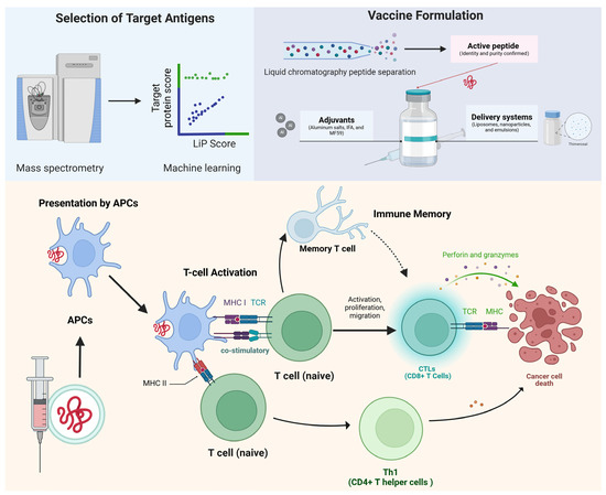 The concept of immunotherapy dates back to the late 19th century when William Coley, a New York surgeon, observed that infections in cancer patients could occasionally lead to tumor regression [1]. This observation led to the development of Coley’s toxins, who had been exploiting streptococcus-mediated tumor rejection, a form of early immunotherapy [2,3]. The identification of tumor antigens in the late 20th century was a pivotal moment for cancer vaccines [4,5]. Tumor antigens are proteins or peptides presented on the surface of cancer cells that can be recognized by the immune system [6,7,8]. This discovery led to the idea that vaccines could be developed to stimulate the immune system to recognize and attack tumors based on these antigens [6,7,8]. Peptide-based cancer vaccines are designed to specifically target these tumor antigens, aiming to elicit a strong and specific immune response against cancer cells [9].