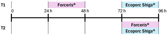 Two experimental groups were established on the second day of life (DOL). Piglets in group T1 were administered Forceris® and Ecoporc Shiga® on different days (24–48 and 72–96 h after birth, respectively); piglets in group T2 were administered Forceris® and Ecoporc Shiga® simultaneously (72–96 h after birth).