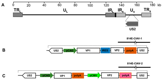 Construction of fosmids containing CIAV VP1 and VP2 genes. (A) The genomic structure of the MDV vaccine strain 814. (B) A schematic diagram of the recombinant fosmid 814E-CIAV-1 with the VP1-IRES-VP2 cassette inserted within the US2 gene in the MDV genome. (C) A schematic diagram of the recombinant fosmid 814E-CIAV-2 with the VP1 and VP2 expression cassette inserted within the US2 gene in the MDV genome.