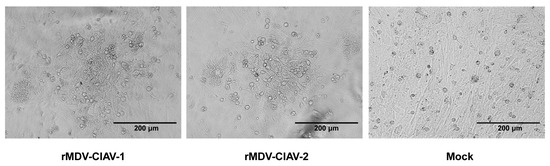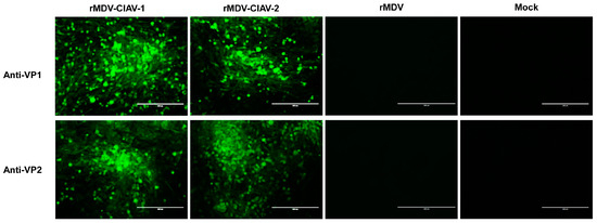 The co-expression of the VP1 and VP2 proteins by recombinant viruses in the infected cells was confirmed using an indirect immunofluorescence assay with anti-VP1 and anti-VP2 antibodies. The results showed that cells infected with rMDV-CIAV-1 or rMDV-CIAV-2 reacted with both anti-VP1 and anti-VP2 antibodies, emitting a green fluorescent signal (Figure 3). In contrast, the cells inoculated with the parental virus did not react with these antibodies. These results indicate that recombinant MDVs co-expressing the VP1 and VP2 genes of CIAV were successfully generated.