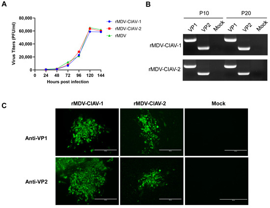 The replication of recombinant viruses was analyzed and compared with that of the parental viruses in CEFs. CEF cultures infected with the viruses were collected at different time points for titer determination. As shown in Figure 4A, the replication kinetics and magnitude of the two recombinant viruses, rMDV-CIAV-1 and rMDV-CIAV-2, were quite similar to their parental virus MDV1 814 vaccine strain (rMDV), indicating that inserting VP1 and VP2 genes at the US2 site did not significantly affect the replication of the MDV vaccine strain in CEFs.