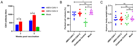 To evaluate the protective efficacy of the recombinant viruses, chickens were challenged with virulent CIAV 21 days post-vaccination, and the HCT and thymus index of the chickens were determined. Chickens in the rMDV-CIAV-1 and rMDV-CIAV-2 vaccination groups showed no clinical signs of disease during the 2-week observation period. As shown in Figure 5B, the HCT value of the chickens in the challenge control group was significantly reduced, with eight out of ten chickens showing an HCT value lower than 27%. In the rMDV-CIAV-1 group, two out of ten chickens had an HCT value lower than 27%, and no chickens in the rMDV-CIAV-2 group showed an HCT value lower than 27%. These results indicated that rMDV-CIAV-2 provides protection against CIAV-induced anemia. After challenge with CIAV, four chickens in the challenged control group showed thymus atrophy with a TBIX < 0.7, and eight and nine chickens in the rMDV-CIAV-1 and rMDV-CAIV-2 groups, respectively, were protected against thymus atrophy caused by CIAV infection (Figure 5C).