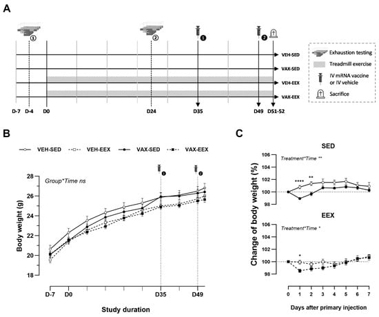 Experimental design and body weight changes. (A) Schematic overview of this study’s design. (B) Evolution of body weight (g) during the course of observation. A linear mixed model (LMM) was constructed with body weight as the dependent variable, and the group and time as the categorical fixed effects. The interaction term group*time was added, revealing that the change in body weight over time did not differ between the groups (p = 0.994). (C) Change in body weight (%) after the first injection with BNT162b2 mRNA or vehicle. Vaccination induced a mild, transient drop in body weight in both the sedentary and exercising mice. A repeated measures two-way ANOVA with Šidák’s multiple comparisons test was performed. The data (B,C) are represented as the mean ± SEM. Group sizes: VEH-SED: n = 17; VEH-EEX: n = 18; VAX-SED: n = 27; VAX-EEX: n = 26. EEX: exercise; SED: sedentary. * p < 0.05, ** p < 0.01, and **** p < 0.0001, ns = non significant.