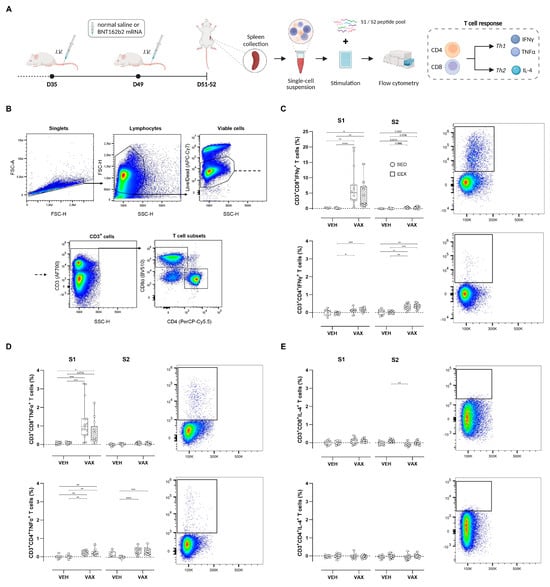 Antigen-specific T cell responses at euthanasia. (A) At euthanasia, mouse splenocytes were isolated from both vaccinated and unvaccinated mice and ex vivo stimulated with S1 or S2 peptide pools, followed by flow cytometric analysis. (B) General gating strategy for T cell subset (CD4+ and CD8+) identification. (C–E) Percentages of CD4+ and CD8+ cells expressing IFNy, TNF-α, or IL-4. Representative plots of each individual cytokine-specific T cell population are illustrated. For each individual animal, percentages per cytokine represent response measured after peptide stimulation, subtracted by unstimulated control (DMSO only). Kruskal–Wallis H test with Dunn’s multiple comparisons test. Group sizes: VEH-SED: n = 8; VEH-EEX: n = 10; VAX-SED: n = 15; VAX-EEX: n = 13. Data are represented as boxplots. IFNγ: interferon gamma; IL-4: interleukin-4; TNFα: tumor necrosis factor alpha. * p < 0.05, ** p < 0.01, *** p < 0.001, and **** p < 0.0001.