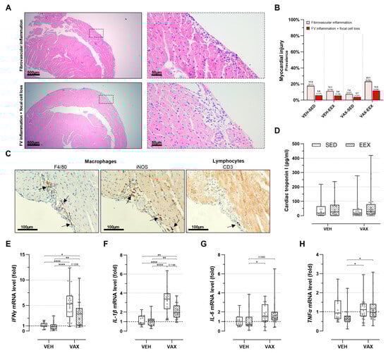 Cardiac injury at euthanasia. (A) Representative images of inflammatory heart lesions at euthanasia on hematoxylin and eosin (HE) staining, revealing fibrovascular inflammation alone (upper panels) or accompanied by focal cell loss (lower panels). (B) Frequency of cardiac injury as determined by histopathological scoring of HE-stained heart sections. Logistic regression model was constructed, including exercise, vaccination, and their interaction as independent variables. Cardiac injury, defined as presence of fibrovascular inflammation, either in conjunction with focal cell loss or not, was used as dependent variable. Likelihood ratio test was performed comparing this model to null model, with all mice having same odds of cardiac injury, and revealed no significance (p = 0.198). Group sizes: VEH-SED: n = 17; VEH-EEX: n = 18; VAX-SED: n = 27; VAX-EEX: n = 26. (C) Immunohistochemical characterization of observed inflammatory heart lesions at euthanasia. Infiltrates were found to have similar density and composition, mainly consisting of macrophages (F4/80+) of pro-inflammatory subtype (iNOS+), with sporadic presence of lymphocytes (CD3+) The arrows indicate immunopositive stained areas. (D) Cardiac troponin I (cTnI) plasma levels as marker for cardiac injury. At euthanasia, no significant differences were observed between experimental groups (p = 0.871). Group sizes: VEH-SED: n = 16; VEH-EEX: n = 18; VAX-SED: n = 27; VAX-EEX: n = 24. Kruskal–Wallis H test. (E–H) Pro-inflammatory cytokine expression levels in hearts at euthanasia as determined by RT-qPCR. mRNA expression levels are expressed as fold change over sedentary vehicle group (VEH-SED). Results are normalized against GAPDH and β-actin. Kruskal–Wallis H testing revealed statistically significant differences between all groups (IFNγ (p < 0.0001), IL-1β (p < 0.0001), IL-6 (p = 0.0118), and TNFα (p = 0.0150)). Pairwise comparisons between all groups were performed by Dunn’s multiple comparisons test. Group sizes: VEH-SED: n = 17; VEH-EEX: n = 18; VAX-SED: n = 27; VAX-EEX: n = 26. Data are represented as (B) frequency histograms or as (D,E) boxplots. Individual values are additionally shown. FV: fibrovascular; IFNγ: interferon gamma; IL-1β: interleukin-1 beta; IL-6: interleukin; iNOS: inducible nitric oxide synthase; TNFα: tumor necrosis factor alpha. * p < 0.05, ** p < 0.01, and **** p < 0.0001.