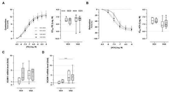Vascular function and inflammation at euthanasia. (A,B) Concentration–response curves and half-maximal effective/inhibitory concentrations for (A) phenylephrine (PE)-induced vasocontraction and (B) acetylcholine (ACh)-induced endothelium-dependent vasorelaxation. At none of the concentrations were group differences in relaxation or contractility observed, nor were significant differences observed in sensitivity of vascular smooth cells for PE or ACh. Group sizes: VEH-SED: n = 5; VEH-EEX: n = 4; VAX-SED: n = 11; VAX-EEX: n = 11. Kruskal–Wallis H test with Dunn’s multiple comparisons test. (C,D) Adhesion molecule expression levels in aorta at euthanasia as determined by RT-qPCR. mRNA expression levels are expressed as fold changes over sedentary vehicle group (VEH-SED). Kruskal–Wallis H testing revealed statistically significant differences between all groups for VCAM-1 (p = 0.0297), but not ICAM-1 (p = 0.0913). Pairwise comparisons between all groups were performed by Dunn’s multiple comparisons test. Group sizes: VEH-SED: n = 5; VEH-EEX: n = 5; VAX-SED: n = 10; VAX-EEX: n = 10. Data are expressed as concentration–response curves or boxplots. Individual values are additionally shown. EC50: half-maximal effective concentration; ICAM-1: intercellular adhesion molecule 1; IC50: half-maximal inhibitory concentration; VCAM-1: vascular cell adhesion molecule 1.