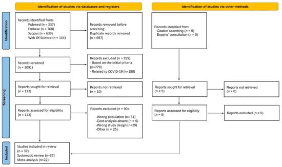 A total of 1788 records were identified by searching PubMed/MEDLINE (n = 237), Scopus (n = 639), Embase (n = 768), and Web of Science (n = 144). Five additional articles [,,,,] were included based on reference screening and expert consultation. After the preliminary exclusion of duplicates (n = 697), a total of 1091 records were screened based on title and abstract. Based on the initial screening, 779 records were removed based on the following criteria: (1) wrong population, (2) inappropriate study design, (3) wrong outcomes, (4) wrong publication type, or (5) language limitations. Additionally, 180 studies related to COVID-19 were excluded. The initial screening process yielded 132 articles for further assessment. Ten reports [,,,,,,,,,] were not retrieved, and after further eligibility checks, thirty-seven studies [,,,,,,,,,,,,,,,,,,,,,,,,,,,,,,,,,,,,] were finally included in the review. However, 22 [,,,,,,,,,,,,,,,,,,,,,] were included in the meta-analysis because the remaining studies did not specifically report the number of anaphylactic shock cases in adults [,,,,,,] or did not clearly define the adult sample [,,,,,,,,]. The study selection process is visually represented in the PRISMA flow diagram (Figure 1), detailing the number of records identified, screened, excluded, and included in the review.