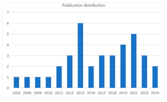 Figure 2 represents the annual distribution of selected publications from 2002 [] to 2024 []. The frequency of publications varied year by year, with a relevant increase in publications in recent years. A primary peak was noted in 2015, with six publications [,,,,,].