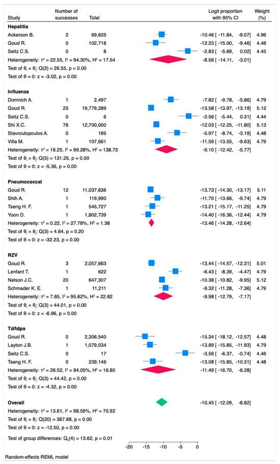 Forest plot of the random-effects model assessing the logit proportion among each vaccine type. RZV = recombinant zoster vaccine. Td/Tdap = tetanus and diphtheria or tetanus toxoid, reduced diphtheria toxoid, acellular pertussis. In the forest plot, the effect sizes of individual studies are represented in blue, the overall effect size for each vaccine type is shown in red, and the overall effect size for all vaccine types combined is displayed in green.