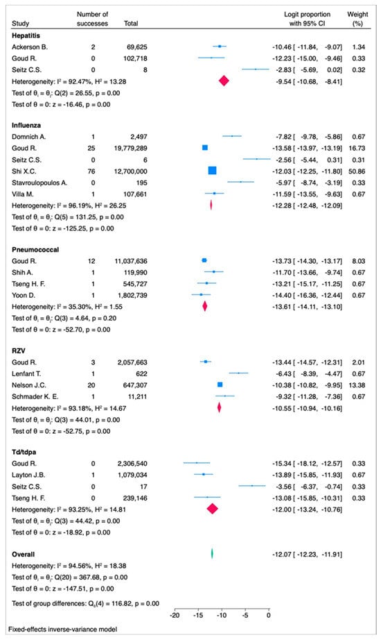 Forest plot of the fixed-effects model assessing the logit proportion among each vaccine type. RZV = recombinant zoster vaccine. Td/Tdap = tetanus and diphtheria or tetanus toxoid, reduced diphtheria toxoid, acellular pertussis. In the forest plot, the effect sizes of individual studies are represented in blue, the overall effect size for each vaccine type is shown in red, and the overall effect size for all vaccine types combined is displayed in green.