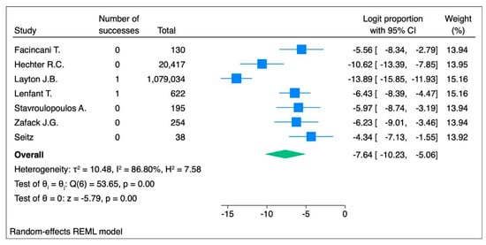 For the seven studies [,,,,,,] on the vulnerable populations (due to chronic conditions or a history of allergies), the random-effects model yielded a logit proportion of −7.64 [95% CI: −10.23, −5.06, p < 0.001] with high heterogeneity (I2 = 86.80%, p < 0.001), corresponding to 48 events per 100,000 subjects (95% CI: 4 to 631) (Figure 7). The fixed-effects model showed a logit proportion of −8.16 (95% CI: −9.09, −7.24, p < 0.001) with high heterogeneity (I2 = 88.82%, p < 0.001), corresponding to 29 events per 100,000 subjects (95% CI: 11 to 72) (Figure S2).