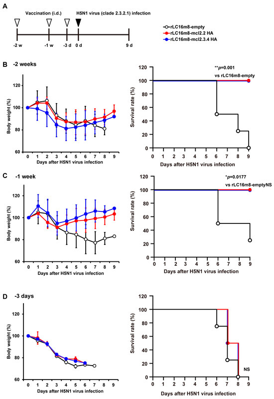 Rapid protective effects induced by rLC16m8-H5 HA against lethal infection with the HPAI H5N1 virus in mice. (A) Experimental schedule of vaccination and H5N1 influenza virus infection in BALB/c mice. Female BALB/c mice were inoculated intradermally with 1 × 107 PFUs of rLC16m8-mcl2.2 HA, rLC16m8-mcl2.3.4 HA, or rLC16m8-empty (B) 2 weeks, (C) 1 week, or (D) 3 days before intranasal infection with 1 × 104 PFUs of H5N1 A/whooper swan/Hokkaido/1/2008 (clade 2.3.2.1). (B) BALB/c mice were infected with the H5N1 HPAI virus 2 weeks after vaccination with rLC16m8-H5 HA. After infection with the virus, body weight was monitored daily (left panel), and the survival rate was recorded until 9 days post-infection (dpi) (right panel). (C) One week after vaccination, the rapid protective efficacy of rLC16m8-H5 HA against H5N1 HPAI virus infection was evaluated by monitoring body weight daily (left panel) and recording survival until 9 dpi (right panel). (D) Three days after vaccination, the rapid protective efficacy of rLC16m8-H5 HA against H5N1 HPAI virus infection was evaluated by monitoring body weight daily (left panel) and recording survival until 9 dpi (right panel). Survival rates are compared in panels (B–D) using the Gehan–Breslow–Wilcoxon method. NS: not significant. * p < 0.05, ** p < 0.01.