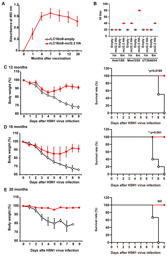 Long-term protection by rLC16m8-H5 HA against lethal infection with the HPAI H5N1 virus in mice. Female BALB/c mice were inoculated intradermally with 1 × 107 PFUs of rLC16m8-mcl2.2 HA or rLC16m8-empty [n = 3–5 in each group except for n = 2 in rLC16m8-mcl2.2 HA in (E)]. (A) The time course of production of immunoglobulin G (IgG) specific to H5 HA (clade 2.2) after vaccination was evaluated by an ELISA. (B) The HI titer of antisera from mice immunized with rLC16m8-mlc.2.2 HA (n = 4) or rLC16m8-empty (n = 4) 1 and 6 months after immunization. HI titers were determined against HPAI H5N1 A/whooper swan/Hokkaido/1/2008 (clade 2.3.2.1; Hok/1/08), A/whooper swan/Mongolia/3/2005 (clade 2.2; Mon/3/05), and A/Vietnam/UT3040/2004 (clade 1; UT3040/04) using 0.75% guinea pig erythrocytes. (C–E) Vaccinated mice were challenged with 166 × 50% mouse lethal dose (MLD50) of HPAI H5N1 A/whooper swan/Hokkaido/1/2008 (clade 2.3.2.1) 12 (C) or 18 (D) months after vaccination. (E) Vaccinated mice were challenged with 150 × MLD50 of H5N1 A/Vietnam/UT3040/2004 (clade 1) 20 months after vaccination. Left panels show body weight changes when monitored daily after the H5N1 virus challenge. Right panels show the survival rate when assessed until 9 days post-infection. ND: not determined (rLC16m8-mcl2.2 HA, n = 2; rLC16m8-empty, n = 3). * p < 0.05, ** p < 0.01.