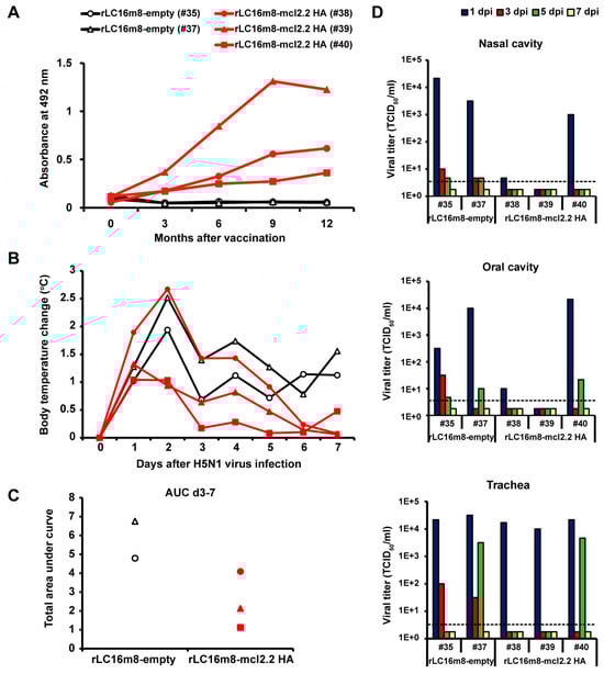 Long-term protection by rLC16m8-H5 HA against lethal infection with the HPAI H5N1 virus in cynomolgus macaques. Female cynomolgus macaques were inoculated intradermally with 1 × 107 PFUs of rLC16m8-mcl2.2 HA (n = 3) or rLC16m8-empty (n = 2) on their upper arms. Twelve months after vaccination, HPAI H5N1 virus A/whooper swan/Hokkaido/1/2008 was inoculated into the nostrils, oral cavity, and trachea of each macaque. (A) The time course of production of IgG specific to the H5 HA protein (clade 2.2) after vaccination was evaluated using an ELISA. (B) The mean value of the body temperature of individual macaques from 8 p.m. to 8 a.m. every night was calculated from the temperature recorded every 5 min. Body temperature changes of individual macaques on each day after virus infection were compared with mean temperature changes from 8 p.m. on day 1 to 8 a.m. on day 0 before virus infection. (C) Cumulative temperature increase, calculated as the area under the curve (AUC) from the data recorded 3 days post-infection (dpi) to 7 dpi in (B). (D) Temporal changes in viral titers in nasal (upper panel), oral (middle panel), and tracheal (lower panel) swab samples were determined by a 50% tissue culture infectious dose (TCID50) assay using Madin–Darby canine kidney (MDCK) cells. The dpis are indicated in navy (1 dpi), red (3 dpi), green (5 dpi), and yellow (7 dpi). The lower limit of detection (1.7 log units) is indicated by a horizontal dashed line.