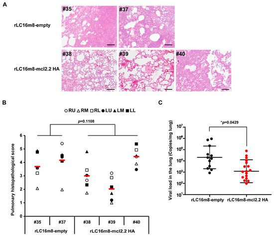 Histopathology and viral load in the lungs of cynomolgus macaques after HPAI H5N1 virus infection. (A) Representative lung sections (hematoxylin and eosin staining; section thickness 4 μm) at 7 days post-infection (dpi); original magnification was 100×. Bar, 200 μm. The number indicates animal ID. (B) Histopathological scores were obtained for each of the 15 defined regions of the lung lobe of each animal (RU, right upper; RM, right middle; RL, right lower; LU, left upper; LM, left middle; LL, left lower) 7 dpi with rLC16m8-empty or rLC16m8-mcl2.2 HA. Red horizontal bars indicate the mean pathological score in each group. p values were calculated using the Mann–Whitney U test. (C) Viral load in all lung lobes was determined by reverse transcription–quantitative PCR. The central horizontal value represents the geometric mean, and the whiskers indicate the geometric SD. p values were calculated by two-tailed non-paired Student’s t-tests. * p < 0.05.