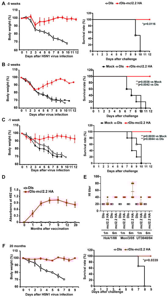Rapid and long-term protection by a single dose of replication-deficient rDIs-mcl2.2 HA against lethal infection with H5N1 HPAI virus in mice. Female BALB/c mice were inoculated intradermally with 1 × 107 PFU of rDIs-mcl2.2 HA or DIs. (A) Vaccinated mice (rDIs-mcl2.2 HA, n = 4; DIs, n = 4) were infected with 1 × 104 PFUs of H5N1 A/whooper swan/Hokkaido/1/2008 (clade 2.3.2.1) 5 weeks after vaccination. Left: body weight was monitored daily after H5N1 virus infection. Right: survival rate was observed until 12 days post-infection (dpi). (B,C) The speed of protection by rDIs-mcl2.2 HA against the HPAI H5N1 virus was investigated. Two weeks (B) or one week (C) after vaccination, mice were infected intranasally with 166 × MLD50 of A/whooper swan/Hokkaido/1/2008 (clade 2.3.2.1) and then monitored daily for changes in their body weight (left panel) and survival rate until 12 dpi (right panel). (D,E) Long-term immunity by a single dose of rDIs-mcl2.2 HA was investigated. (D) The time course of production of IgG specific to the HA protein (clade 2.2) was measured by an ELISA. One thousand-fold diluted murine sera were used. (E) The HI titer of antisera from mice immunized with rDIs-mlc.2.2 HA (n = 4) or DIs (n = 4) 1 and 6 months after immunization. HI titers were determined against HPAI H5N1 A/whooper swan/Hokkaido/1/2008 (clade 2.3.2.1; Hok/1/08), A/whooper swan/Mongolia/3/2005 (clade 2.2; Mon/3/05), and A/Vietnam/UT3040/2004 (clade 1; UT3040/04) using 0.75% guinea pig erythrocytes. (F) Vaccinated mice were infected intranasally with 1 × 104 PFUs of H5N1 A/whooper swan/Hokkaido/1/2008 (clade 2.3.2.1) after 20 months. Survival rates are compared in data shown in panels (A–C,F) using the Gehan–Breslow–Wilcoxon method. * p < 0.05, ** p < 0.01.