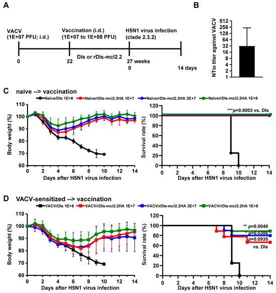 Protective efficacy of rDIs-mcl2.2 HA against the HPAI H5N1 virus in VACV-sensitized mice. (A) Experimental schedule. To investigate the protective efficacy of a single dose of rDIs-mcl2.2 HA against lethal infection with the HPAI H5N1 virus in VACV-sensitized mice, female BALB/c mice were sensitized intradermally with 1 × 107 PFUs of the VACV LC16m8 strain and then immunized intradermally with rDIs-mcl2.2 HA (1 × 107 PFUs, 3 × 107 PFUs, or 1 × 108 PFUs) 22 weeks after VACV sensitization (D). Age-matched naïve mice were used as controls (C). (B) A total of 21 weeks after VACV sensitization, the neutralization titer (50% neutralization) against LC16m8 was measured. Dashed lines denote the limits of detection. (C) Naïve mice were inoculated with rDIs-mcl2.2 HA and then infected intranasally with 166 × MLD50 of A/whooper swan/Hokkaido/1/2008 (clade 2.3.2.1) 5 weeks after vaccination. Body weight (left panel) and survival rate (right panel) were monitored daily. (D) VACV-sensitized mice were inoculated with rDIs-mcl2.2 HA and then infected intranasally with 166 × MLD50 of A/whooper swan/Hokkaido/1/2008 (clade 2.3.2.1) 5 weeks after vaccination. Body weight (left panel) and survival rate (right panel) were monitored daily. Survival rates are compared in panels (C,D) using the Gehan–Breslow–Wilcoxon method. * p < 0.05, ** p < 0.01, *** p < 0.001.