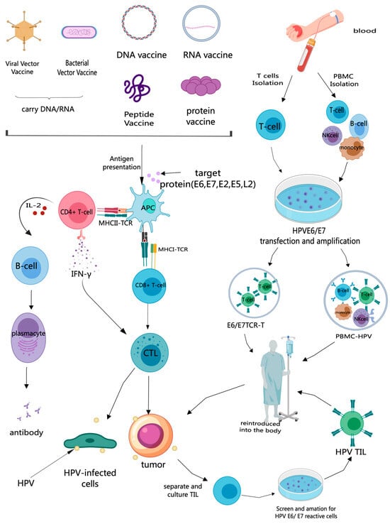 On the other hand, cell-based vaccines involve isolating T cells or other immune cells from the patient’s blood or tumor, ex vivo transduction with HPV E6/E7, preparation into HPV cell-based vaccines, and then reinfusion into the patient [27,28,29], such as the T cell receptor-engineered T cell (TCR-T) vaccine [27], dendritic cell (DC) vaccines [30], immunotherapeutic vaccines based on B cells and monocytes [29], HPV Tumor Infiltrating Lymphocyte (HPV-TIL) vaccines [31], and autologous peripheral blood mononuclear cell (PBMC) vaccines [28] (Figure 1).