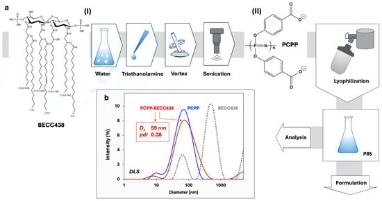 The approach to the development of PCPP-enabled nano-scale formulations of BECC438 involved a two-step process. First, a dispersion of lipid A molecules was prepared by mixing BECC438 with deionized water, adding triethanolamine, agitating, and sonicating the mixture (Figure 1a, step (I)). The sub-micron size dispersion of BECC438 (Figure 1b) was then admixed to an aqueous solution of PCPP as a solubilizing excipient, and the resulting formulation was stabilized and dehydrated by lyophilization (Figure 1b, step (II)). Analysis of the resuspended lyophilized material in PBS (pH 7.4) by DLS revealed a monomodal size distribution of nano-scale dimensions, which resembled the profile of unmodified PCPP (Figure 1b). The formulation was visually clear and did not contain any submicron or micron-sized aggregates as detected by DLS.