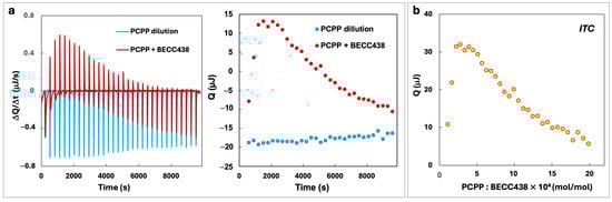 (a) ITC data of PCPP interaction with BECC438 and the corresponding heats of dilution of PCPP (50 mM phosphate buffer, pH = 7.4, 25 °C) and (b) binding isotherm corrected for the heat of dilution.