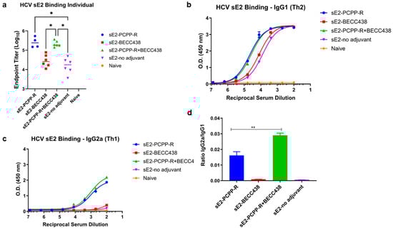 To assess the immune response, mice were immunized with a formulation of sE2 antigen (refer to Table 1) in which the prime consisted of 50 μg sE2A and three boosts of 10 μg sE2 two weeks apart. A terminal bleed was taken at day 56 after the initial immunization. As shown in Figure 4a, the total IgG titers for both sE2-PCPP-R and sE2-PCPP-R+BECC438 groups are about 10-fold higher than those of BECC438 alone or the no adjuvant-sE2 group. Similarly, the isotype-specific analysis of IgG1 (T helper 2, Th2) and IgG2a (T helper 1, Th1, a surrogate marker for the induction of cellular immune responses) shows that in comparison to other groups, the sE2-PCPP-R and sE2-PCPP-R+BECC438 have superior IgG1 titers (Figure 4b) and a significantly higher IgG2a titer (Figure 4c). Since BECC438 and the no-adjuvant group showed negligible Ig2a antibodies, the elicitation of IgG2a isotype antibodies can be largely attributed to the PCPP-R component (Figure 4c). A further analysis shows that the combination adjuvant PCPP-R+BECC438 achieves a statistically significant difference in the ratio of IgG2a/IgG1 over sE2-PCPP-R (1.8-fold) and sE2-BECC438 (30-fold) using a one-way analysis of variance (ANOVA) test of sE2-PCPP-R+BECC438 versus sE2-BECC438 (p < 0.01) (Figure 4d). Thus, the inclusion of BECC438 in PCPP-R+BECC438 helped establish a more balanced Th1/Th2 response.