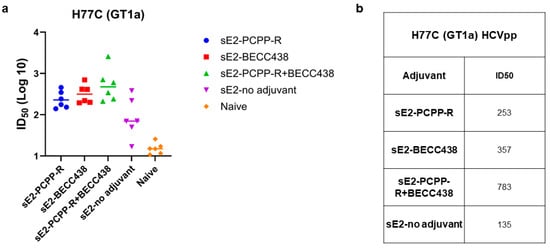 We next analyzed the serum from individual mice in each group for its ability to neutralize HCV pseudoparticles (HCVpp) made from the homologous GT1a (H77) strain from which the sE2 antigen was derived (Figure 5). Our results show that in comparison to the non-adjuvant group (sE2 only), individual mice in all adjuvant groups (PCPP-R, BECC438, and PCPP-R+BECC438) produced neutralizing responses, as measured by ID50 values (inhibitory dilution at which 50 percent neutralization is attained) with some mice in the binary adjuvant group showing higher titers over individual mice in the other groups (Figure 5a). As shown in Figure 5b, the mean HCVpp ID50 values show that the titers for the PCPP-R+BECC438 group is indeed 2–3 times higher than the BECC438 or PCPP-R group, respectively. Although not statistically significant, the neutralization responses indicate a potential synergy for the binary adjuvant with HCV sE2 antigen. We also tested the mouse sera for their ability to neutralize heterologous HCVpp, but the neutralization was weak across all groups and did not exhibit any differences across groups. This is an issue we plan to examine in a future study.