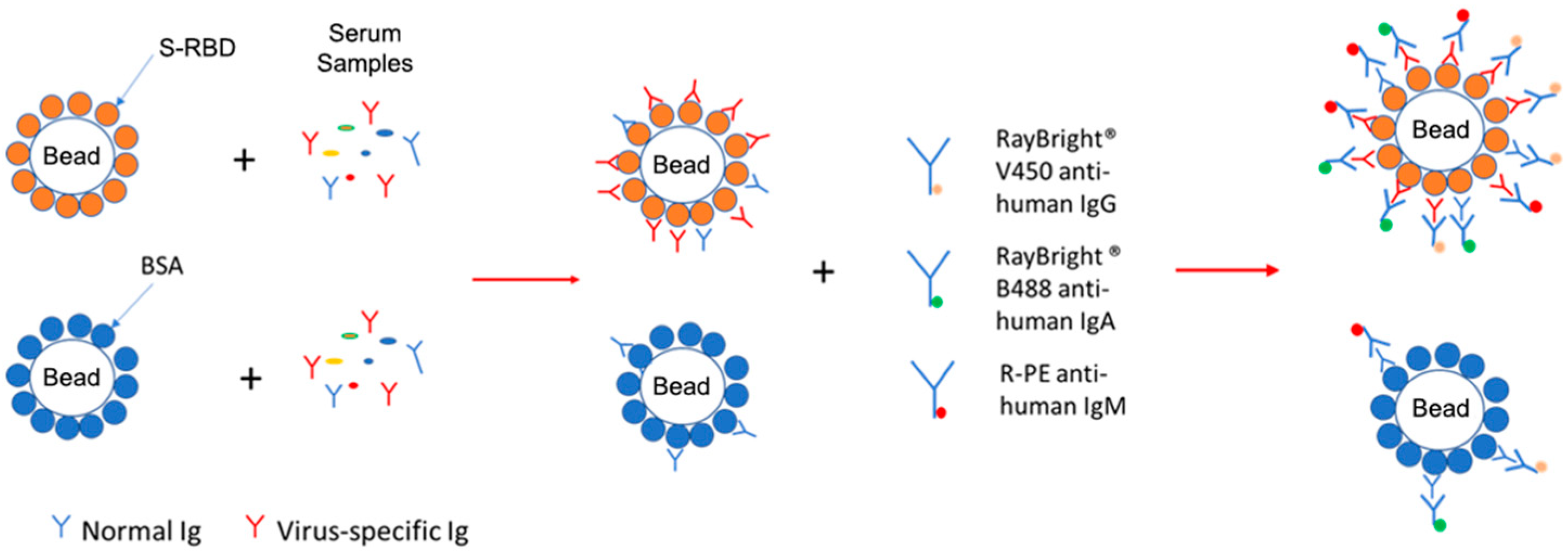 Zhang B, Zhang Z, Zhao Y, Lu J, Fang J, Petritis B, Whittaker K, Huang R, Huang R-P. A Novel Flow Cytometry Array for High Throughput Detection of SARS-CoV-2 Antibodies. Vaccines. 2025; 13(10):1063. https://doi.org/10.3390/vaccines13101063