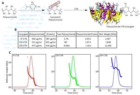 Polysaccharide activation was performed using 1-cyano-4-dimethylaminopyridinium tetrafluoroborate (CDAP) (Sigma-Aldrich, St. Louis, MO, USA) following the method of Lees et al. []. Cyanation was carried out at a 1:1 polysaccharide-to-CDAP weight ratio in 0.25 M HEPES and 1 M NaCl at pH 9.0 for 7 to 10 min. CTB was then added at a 1:1 weight ratio, and the conjugation reaction was incubated overnight at room temperature. The reaction was quenched with glycine, and the conjugate was buffer exchanged into 10 mM phosphate buffer at pH 7.0.