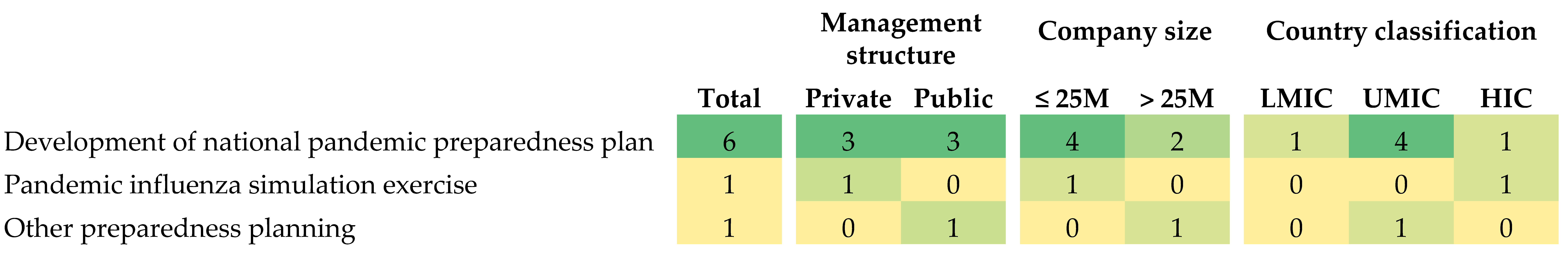 Seven of the manufacturers (64%) indicated involvement in national pandemic influenza preparedness planning. Figure 4 provides a heatmap of the pandemic preparedness planning activities, stratified by company management structure, company size, and country classification by income level. Many of the manufacturers, especially those in upper MICs, have been involved in the development of the national pandemic influenza preparedness plan. However, only one manufacturer indicated participation in a pandemic influenza simulation exercise.