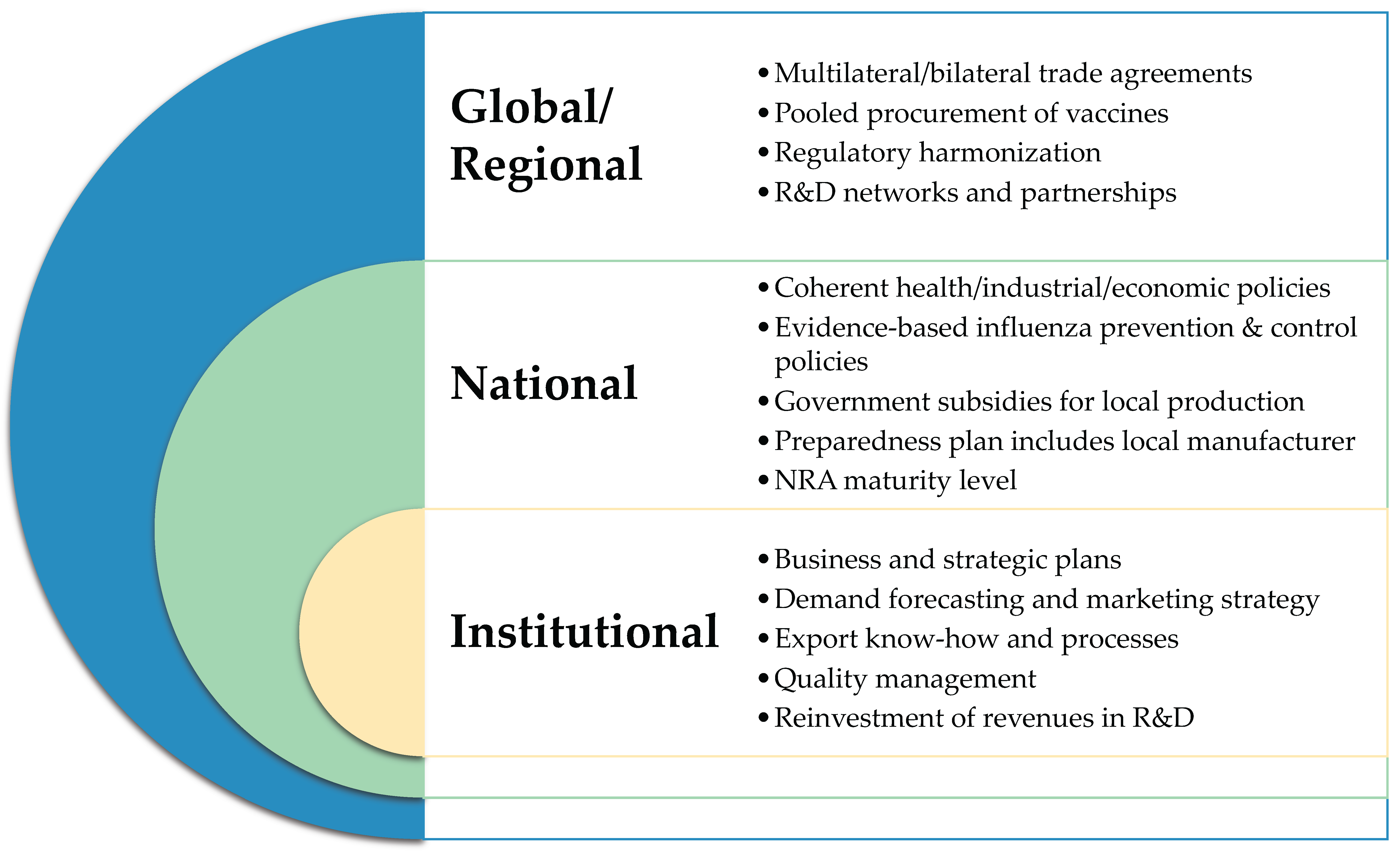 Most recently, in May 2025, the Seventy-eighth World Health Assembly adopted the Pandemic Agreement through resolution 78.1, calling for a variety of measures to achieve sustainable and geographically diversified local production, including skills development, public and private sector investments, advanced purchase agreements, and public-private partnerships [14]. Previous frameworks have addressed the enabling environment for local production of vaccines, recognizing the interplay between supply and demand. One framework was developed under GAP and considered the sustainability of local production of influenza vaccines in terms of six factors: the policy environment and healthcare system, surveillance systems and influenza disease and economic burden, product development and manufacturing, product approval and regulation, communication to support influenza vaccination, and financing [15,16]. Additional frameworks have been developed to address the enabling environment, including the viability of manufacturers and the Health Vaccines Market Framework [17,18,19].