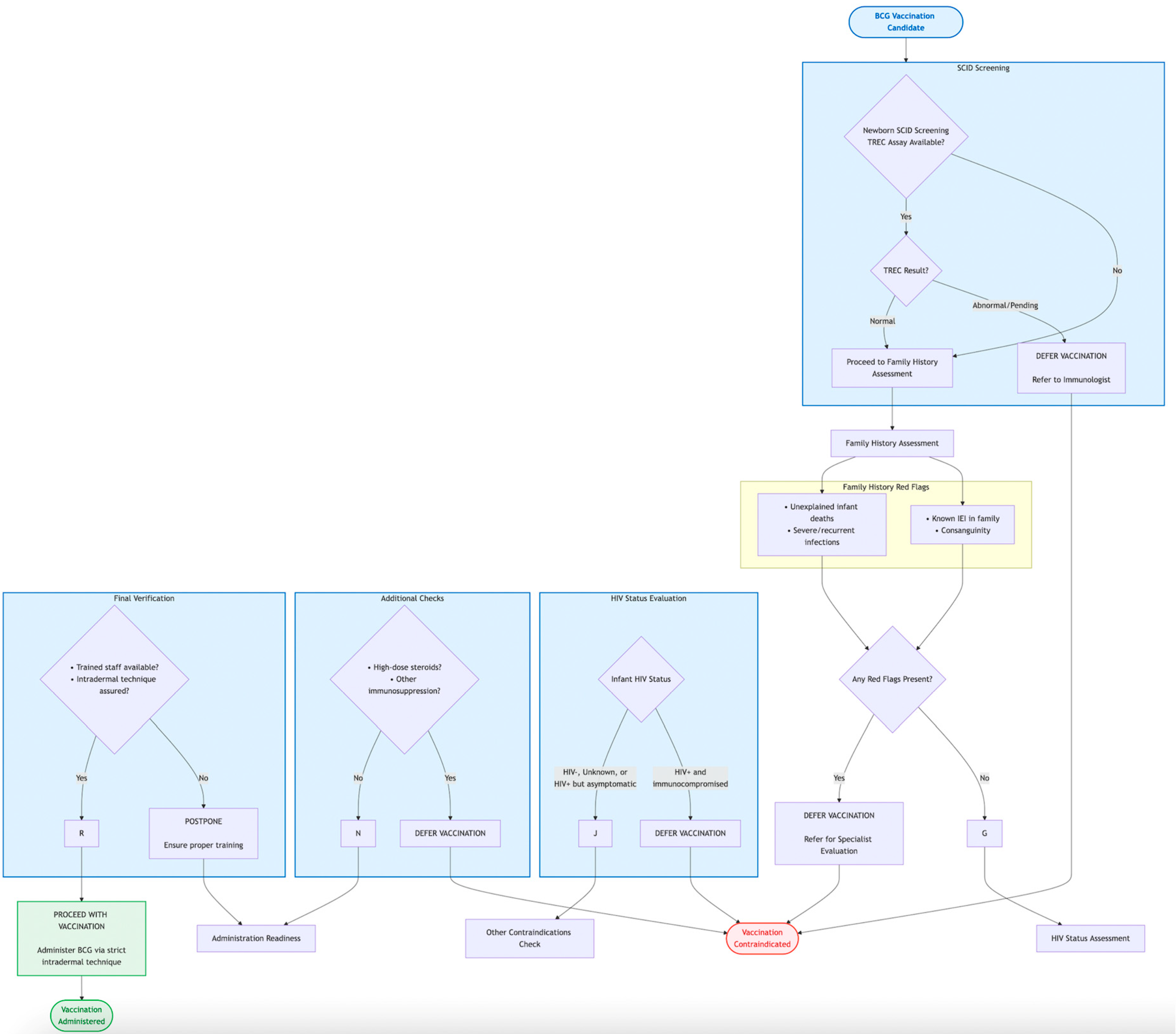 - Global Expansion of Newborn Screening: A major public health effort is needed to make SCID screening accessible and routine in all countries that employ universal BCG vaccination. This will require overcoming significant economic and infrastructural barriers, especially in low- and middle-income countries (LMICs) but promises to virtually eliminate the deadliest complication of the vaccine. Strengthened Pre-Vaccination Screening: In the immediate term, enhancing the systematic use of detailed family history questionnaires, as operationalized by the BCG-RAKE checklist, provides a viable and critical strategy to identify at-risk infants in all resource settings.