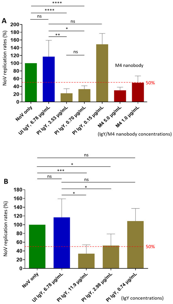 Neutralization activity of P domain- and the S domain-specific antibodies against replication of homotypic GII.4 Sydney norovirus in the human intestinal enteroid (HIE) system. (A) Neutralizing effects of extracted IgY raised against norovirus P domains on viral replication. The X-axis indicates the extracted IgY and control antibodies at indicated concentrations. The Y-axis shows virus replication rates of the treated viruses relative to the untreated virus control (no IgY, set as 100%). (B) Neutralizing activity of extracted IgY following immunization with the norovirus S domain protein against viral replication. The X-axis indicates the extracted IgY and control antibodies at various dilutions. The Y-axis shows norovirus replication rates of the treated viruses relative to the untreated virus control (no antibodies, set as 100%). In both experiments, the known M4 nanobody [34] at various concentrations was used as positive controls. Dashed lines indicate the 50% and 100% levels. UI IgY indicates unimmunized IgY; PI IgY indicates post-immune IgY. Statistical differences between groups are indicated as non-significant (ns) when p > 0.05; significant (*) when p < 0.05; highly significant (**) when p < 0.01; and extremely significant (*** or ****) when p < 0.001, or <0.0001, respectively.