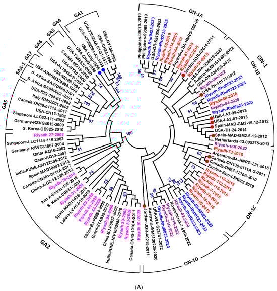 Phylogenetic analysis of the 2nd HVR G gene resulted in the clustering of the HRSV-A strains into 8 genotypes: GA1–GA7 and SAA1. The GA1 clade includes the extinct strains identified early in the USA. The GA2 clade is divided into two subclades: the ON1 subclade with four cluster groups (ON1A to ON1D) and the other GA2 strains subclades (Figure 3A). The Saudi strains identified in the 2 winter seasons of 2007/08 and 2008/09 were clustered into the GA2 genotype, whereas strains of the 5 winter seasons of 2014/15, 2016/17, 2019/20, 2021/22, and 2022/23 were clustered within the ON1 genotype with no special preference for distinct subgenotypes (Figure 3A). The strains are scattered and clustered within genotypes on the basis of their genetic relatedness, with no effect on the period.