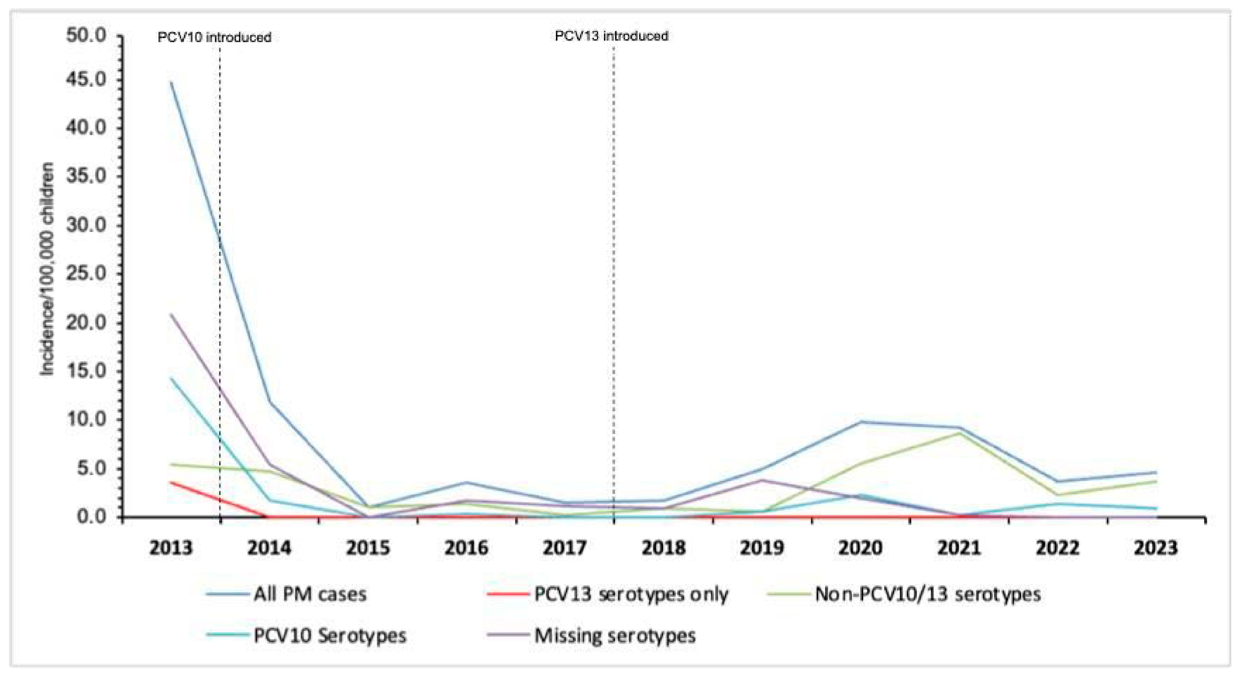 Table 2. Comparison of pneumococcal meningitis incidence between PCV10/3p+0 period (2013–2017) and PCV13/2p+1 period (2020–2023).