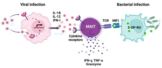 Distinct pathways in MAIT cell activation during viral and bacterial infections. MAIT cells are activated through two distinct pathways: a cytokine-mediated pathway during viral infection and a TCR-dependent pathway during bacterial infection. In viral infection, virus-infected cells or APCs recognize viral components through pattern recognition receptors (PRRs) such as TLRs, triggering the production of IL-12 and IL-18. Cytokine binding to the cognate receptors on MAIT cells initiates signal transduction, resulting in the production of IFN-γ, TNF-α, and granzymes in MAIT cells. In bacterial infections, the metabolite 5-OP-RU from the riboflavin biosynthesis pathway is presented on MR1 molecules, and recognized by the MAIT cell TCR, which in turn triggers the activation. Created in BioRender. Sugimoto, C. (2025) https://BioRender.com/p37q702 (accessed on 01 February 2025).