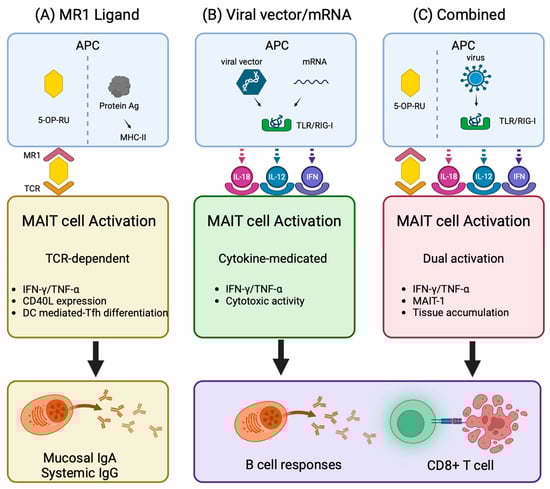 Summary of MAIT-cell-targeted vaccine strategies. (A) MR1 ligand strategy: Co-administration of 5-OP-RU and protein antigens activates MAIT cells through TCR-mediated recognition of MR1 ligands. Activated MAIT cells produce inflammatory cytokines (IFN-γ, TNF) and enhance B cell responses through Tfh differentiation via CD40/CD40L-mediated interactions with dendritic cells. This enhanced B cell activity promotes production of protein antigen-specific mucosal IgA and systemic IgG [75]. (B) Viral vectors/mRNA strategy: Viral vectors and mRNA vaccines activate MAIT cells through cytokine-dependent pathways mediated by APC-derived IL-18, IL-12, and type I IFN. Although these platforms share common activation mechanisms, they elicit distinct immunological outcomes: non-replicating adenoviral vectors (ChAdOx) enhance antigen specific CD8+ T cell responses [76], while replication-competent adenoviral vectors promote B cell responses in non-human primate models [77]. mRNA vaccines enhance B cell responses [78]. (C) Combined strategy: Combination of 5-OP-RU and replicating virus engages both TCR- and cytokine-elicited pathways. This dual activation promotes MAIT-1 differentiation, leading to IFN-γ/TNF production, and tissue accumulation, thereby enhancing antigen-specific CD8+ T cell responses [79]. Created in BioRender. Sugimoto, C. (2025) https://BioRender.com/z83u834 (accessed on 1 February 2025).