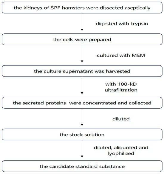 The raw material used to produce the candidate standard substance was obtained from the BIBP (Beijing, China) and was prepared according to the principles of Good Manufacturing Practice and the guidelines of the Pharmacopoeia of the People’s Republic of China. Briefly, the kidneys of SPF hamsters were dissected aseptically, the kidney tissue was digested with trypsin, and the cells were prepared and cultured with MEM. After the cells grew into a dense monolayer at 34–35 °C, the medium was changed, and the cells continued to be cultured for 4 days. The culture supernatant was harvested. The secreted proteins in the supernatant were concentrated with 100 kD ultrafiltration and collected. This protein solution was the raw material. The stock solution was prepared by diluting it fivefold.