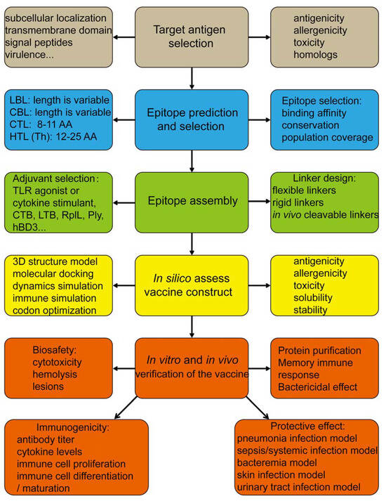 As an interdisciplinary field, bioinformatics provides crucial tools for the in silico prediction and analysis of epitope-based vaccines. The rational workflow for epitope-based vaccine design is illustrated in Figure 1, which includes target antigen selection, epitope prediction and selection, epitope assembly, an assessment of the fusion epitope-based vaccine construct in silico, and the verification of the biosafety and efficiency of the epitope-based vaccine in vitro and in vivo.